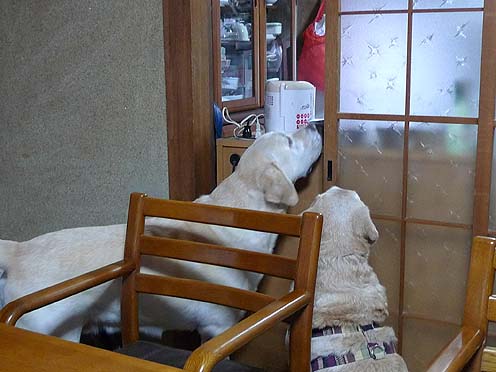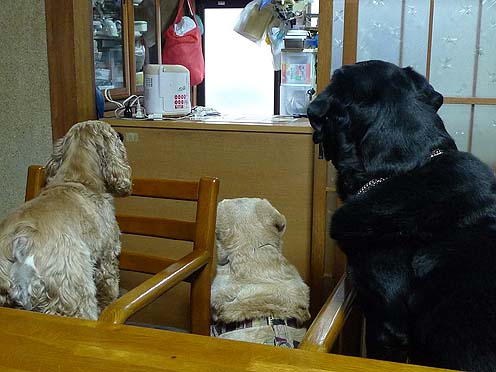 出勤前のエリちゃんがワン達の朝ご飯の支度中。