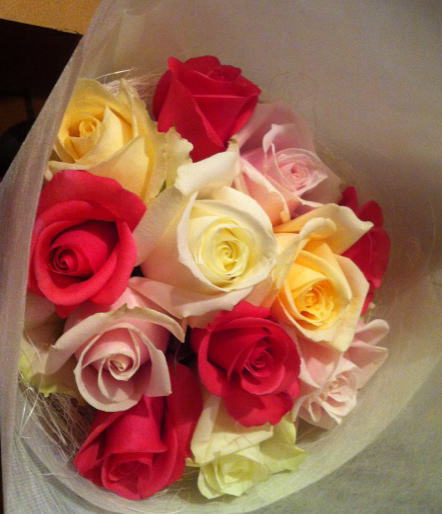 友人は再会を祝して,とゆーか,ワタシが4月生まれということを覚えていてくれて(誕生日まで覚えてくれていた),バラの花束を持ってきてくれました。嗚呼,そういうサプライズ好きなとこ,昔からあったよねぇ。どうもありがとう〜。