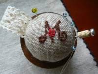 クロスステッチのウッドピンクッションが完成しました♪クロスステッチはやったことがあったので“できるでしょ”と簡単に考えていたのですが、リネンの細かい生地の目に刺繍を刺すのは思っていた以上に大変。目が均等ではないのでむずかしくて…。叔母さんにも「それならフリーステッチのほうがよっぽど簡単」と言われたのですが、とにかくやってみようと半ばいい加減に進めた結果、何目か進めたところでまちがえたことに気付きました。ハイ、最初から〜!全部ほどいてやり直したところ、今度は運良くできました。奇跡♡ |