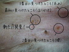 最初に見つけた部分は赤い発疹からしみのような黒い色素のかたまり(ブルアイ=牛の目と呼ぶそうです)になりました。塗り薬の効果か…少しずつ薄くなってきた気がします。今のところ、痛がったりかゆがったりする様子もなく薬もおとなしくつけさせてくれます。早くに気づいたので塗り薬だけで良くなりそうです。
