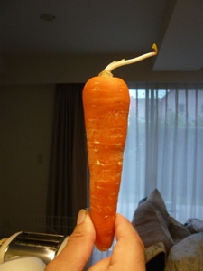 野菜室のニンジン、放置していたらいつの間にか芽が…(汗)びっくり。いつごろ買ってきたニンジンかも覚えていないくらいだったのですが、トモさんが「使えそう」と言ってシチューの中に入れてしまいました。もしお腹を壊したとしても、食べすぎなのか、ニンジンのせいなのか。今のところ、腹痛などの症状はありません。