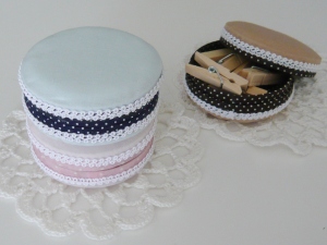 家に帰ってきてから先日のマカロン作りの続き。厚紙を組み立てて布を貼りながら丸い箱を作る要領で作っていき、外側は無地の生地、内側は少し濃い色のドット柄でピンク・ブルー・ブラウンの3色のマカロンを作りました。微妙に大きさのちがうマカロンになってしまいましたが、形になって大満足!マカロンのでき上がり〜♪かわいい(*´ェ`*) 中にクリップを入れてみました。リボンや小さい手芸の材料を入れてもいいかも。マカロンらしい色の生地を探して、もう何種類か作りたいと思っています。 |