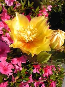 どうしてこんなところに…。つつじの花壇の中から無理やり顔を出して咲いていたサボテンの花。いくつか蕾になっていて、そのうちの3つ花が咲いてました。たしか朝には咲いていなかったし、一緒にいた方が「昨日咲いていた花はしぼんでしまった」と言っていたので、花は咲いたあと数時間でしぼんでしまうみたいです。