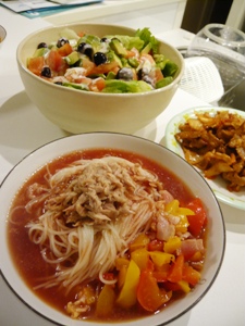 疲れました〜!少し前に大規模な図書の移動があり、だいぶ本が減ったのですが、一部の書架にかたよっていて整理できていない状況…。今日は朝の返却本の担当だったので、出し入れがしやすいようにいちばん上の棚は空けて、空いている棚に本を移動しながら、なるべく均一に並ぶように整理しました。約2時間にもおよぶ肉体労働で朝から疲労困ぱい。 さらに、新着図書の紹介コーナーを撮影しにくるというので大騒ぎ!一応、何人かで担当しているのですが、最近ではほとんど私がメインで飾りつけをしてました。今回、新しいラベルのデザインはセンスの良いスタッフさんにお願い。以前コーナーを担当していたスタッフさんも手伝ってくれて、何とか時間までにコーナーの更新完了♪ 今日の夜ごはんは夏バテ予防に良さそうな献立になりました。気になっていたトマトのつゆを使ったそうめんに豚キムチ、トマトとアボカドのサラダです。トマトのつゆはコクがあって、めんつゆとトマトジュースの味がほんのり。トモさんは苦手のようです。味は別にして、献立としてはバランスがとれているのではないかと…。明日もお仕事。がんばりマス! |