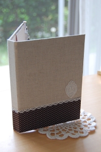 創作DAY♪「ちいさな布箱-はじめての手作りカルトナージュ」を参考に、仕事で使っているリングノート用のノートカバーを作ってみました。 使い勝手とデザイン性を考えて、ちょっとだけアレンジ。ペンをさす部分はメモ帳カバーの作りかたに書いてあったので応用。「Tukinousagi」さんのワークショップに参加したときに教えてもらった“2枚の生地を合わせて貼る”部分もうまくいきました!イニシャルモチーフもいい感じ。あとは背の部分に持ち手がついてたら便利かな…。1つ作るのに半日ほどかかってしまいましたが、完成してうれしいです♪楽しかった〜!