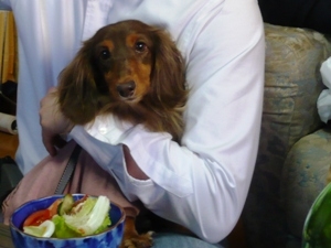 チョコさんといえば、目の前の食べものが気になってしょうがない様子。盗み食いしないようにイトコにがっちりガードしてもらっていたのですが、得意のおねだり攻撃でいろんな人からお肉、キュウリ、レタス…と、次々にゲット。みなさん…くせになるので、チョコさんに食べものをあたえないでください。 帰りにビールやジュースなど…いろいろともらって帰ってきました。非常に家計が助かります。 |