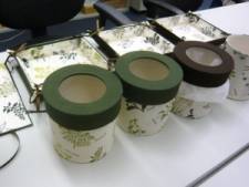 食事休憩をはさんで、午後からは本格的に表彰式とお茶会の準備にとりかかかりました。お茶会セット(ダストボックス&リボントレイ)もすべて完成!私の思いつきの持ち込み企画におつき合いいただき、お手伝いしてくれたスタッフさんたちに感謝です♪今回作ったお茶会セットですが学園祭が終わったあとで(希望があれば)スタッフさんたちにもらっていただこうと思っています。記念にしてもらえればうれしいのだけれど…。 |