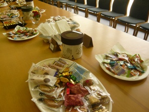 学園祭2日目、いよいよ図書館主催の読書感想文コンクールの表彰式とお茶会当日。朝のミーティングのあと、各々が表彰式とお茶会に分かれて準備開始。私が表彰式準備を終えて、お茶会準備の手伝いに行ったときにはすでにテーブルにはお菓子が並べてあり、準備もほぼ終わっていました。昨年にくらべるとお菓子の量が少ないとはいえ、なかなか豪華!イベントがはじまる前に、少し早い休憩となりました。せっかくなので展示のブースを見てまわり、もらったチケットで模擬店の焼きそばを買って食べました。