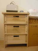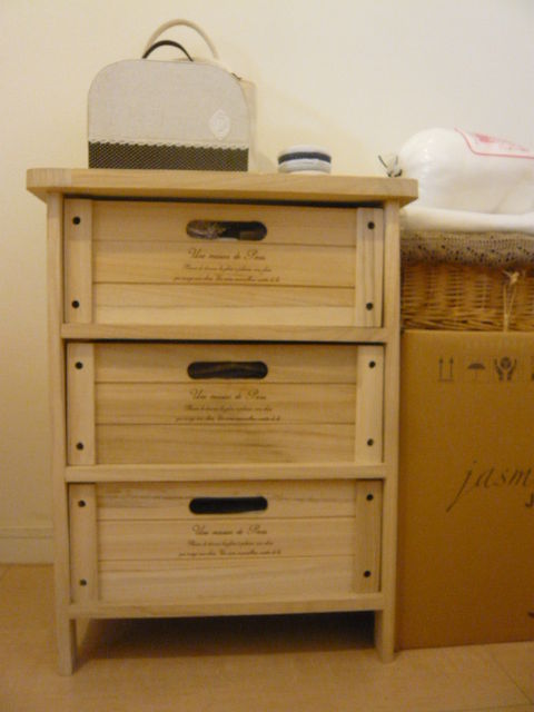 仕事帰りにイオンレイクタウンに行って3,150円で写真の棚を手に入れてきました。今まで手芸用品やキットがカゴにざっくりと入っていたり、出しっぱなしになっていたりしたので整理するための棚を買ってきたというわけです。使っていないものは捨て、生地・手芸キット・道具を種類別に分けて入れると、かなりスッキリしました!あまり使っていないところもたまにチェックしないとダメですね。