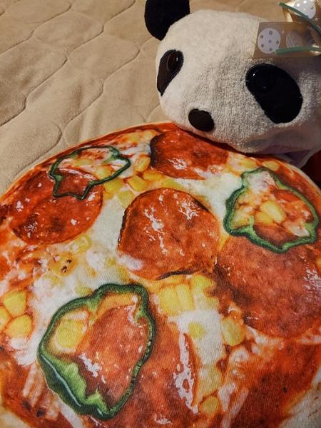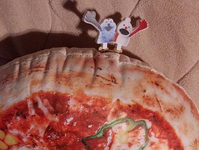 スーパーのお菓子売り場にあったそうで、このピザクッションの端っこには、ちっちゃなパペットスンスンのスンスンとのんのんがついています。