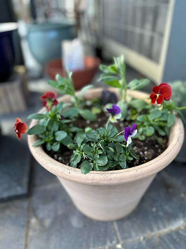 上の寄せ植えは、真ん中にこれまた黄色のラナンキュラスの