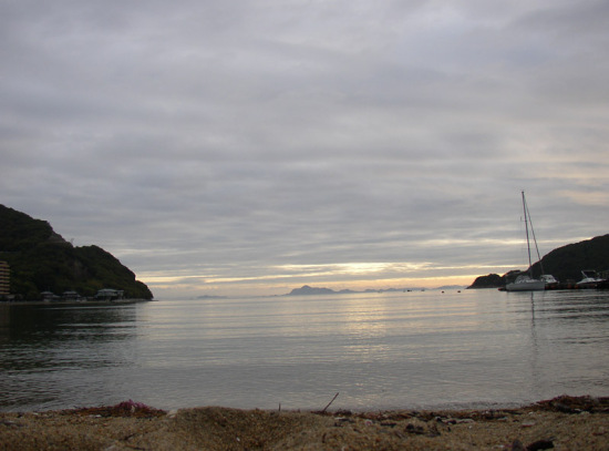 夜明けの静かな入江です。打ち寄せる波の音に、ホーホケキョ、と鶯の鳴き声が重なって・・・私は眼をとじ、邪魔にならないように、ゆっくり息を吸ったり吐いたり・・・久しぶりの一人旅