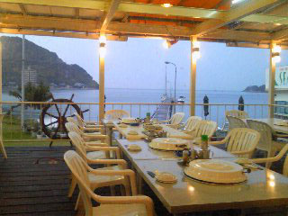 前夜の、宿のテラスです。「シータイガーアイランドイン」というこじんまりとしたお宿は、小豆島の福田港から歩いて30分くらいのところにあります。マリンスポーツや釣りなどを楽しむ人が好んで泊まるお宿のようで、この日も西宮や須磨から家族でいらしてました。西宮からのみなさんはモーターボートで海上から。