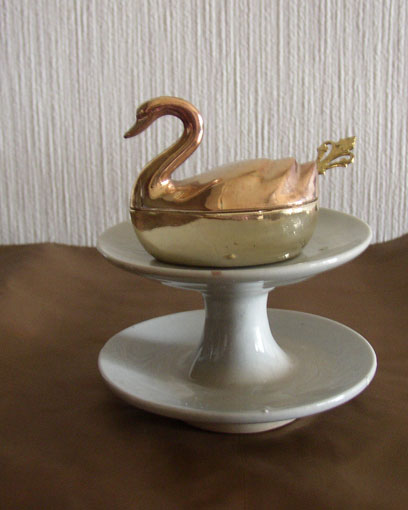 スワンはマスタードとかわさびを入れて楽しむ容器なんですが、テーブルクロスの上に置くよりも、いいかも?