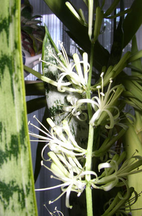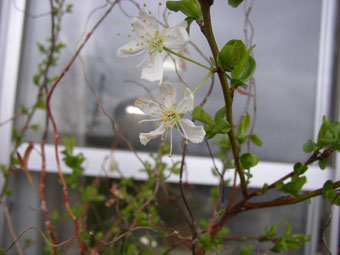 これはですね、喘息もちのわたしに、いい空気を出してくれるから、とプレゼントしていただいたはっぱ。これをくださった方は病気になられ、わたしは元気になって、なんだか申し訳ないような・・・いただいて11年目の今年、初めて花をみせてくれました。ありがとう、はっぱさん、と、お花さん。 |