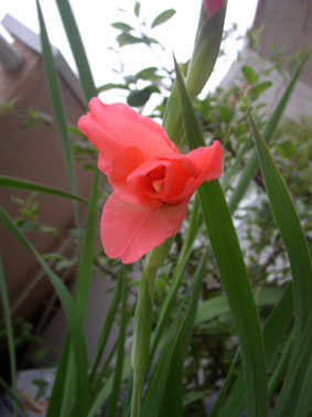 つぎはグラジオラス、大味な女のようで、なんとなく避けて通る花なのです。そんな思いが相手にもわかるのかな・・・水も肥料もやってはいるけれども、愛情はあんまり注いでいなかったグラさんが、きりりと締まった花を咲かせてくれました。あ、買い物のおまけにもらった球根を植えて、ことしで10年目くらいになります。 |