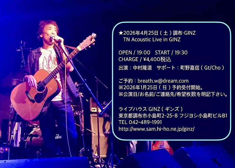 OPEN/17:00 START/18:00 CHARGE/前売¥4,000+1オーダー 当日¥4,500+1オーダー 出演:中村隆道 band member:町野嘉信(Gt)、板倉雅一(Key)、阿久井喜一郎(Dr)、宮島朋之(Ba)